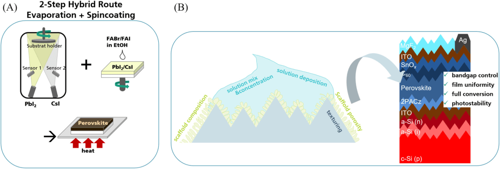 Monolithic perovskite silicon tandem solar cells with the fully-textured architecture are promising due to their efficient light management scheme as well as compatibility to industrial silicon production lines. To achieve high-efficiency, and more importantly reproducibility, perovskite deposition parameters should be well controlled. In the recently published paper, we look into the impact of perovskite process parameters (with the hybrid evaporation/spincoating method) on the final film’s crystallinity, morphology, and optoelectronic quality. Furthermore, we investigate the impact of the underlying silicon texture on the perovskite’s homogeneity and phase purity. Overall, the work provides important insights for ensuring reliable perovskite formation with the hybrid method.